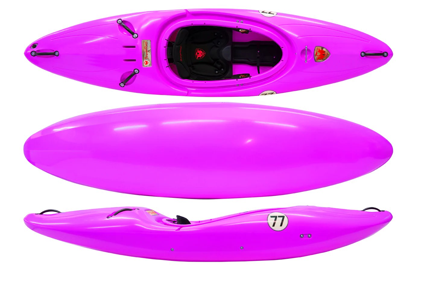 The rocker is slightly more relaxed, and the hull lightly curved side to side, giving it a smooth edge to edge feel requiring minimal body input. Easy to roll because of the curved lines throughout, it allows you to push yourself taking cool lines through your favorite rapids. It resurfaces instantly, carrying forward speed moving you out and away from drops keeping your fast zippy flow going.